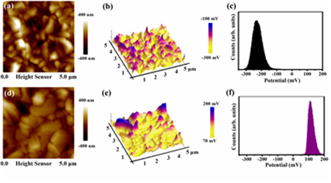 图 1. AFM图a、d)、KPFM 电位图b、e) 和表面接触电位差分布c、f)。 a-c) 没有掺入Ag的CZTSSe样品;d-f) 掺入Ag的CZTSSe样品。