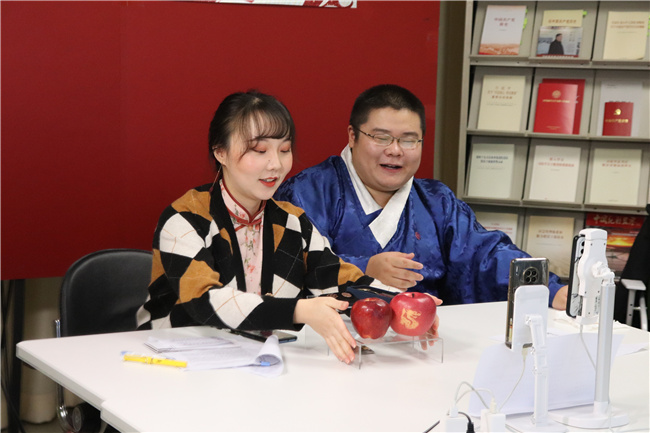 为了找到最准确、专业的商品介绍,支部成员发挥学科特色,通过知网等数据库找到了一些与庄浪农副产品相关的线上资源研读,“男主播”魏博鑫还购买了《庄浪县志》,只为充分了解庄浪,“做一回庄浪人,不说外行话”。“女主播”刘殊利是“史于南开”宣讲团团长,在直播过程中还加入公益助农主题宣讲。其他支部成员也纷纷亮出“绝活”,有的为展示庄浪毛笔在直播现场挥毫泼墨,手书“助力庄浪,乡村振兴”;有的为助兴直播,吟诵原创诗词、合唱经典曲目;支部成员还用庄浪苹果、土豆制作精美菜品,现场“吃播”。