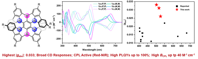 针对以上问题,王小野团队设计合成了一类新型硼氮杂双重[7]螺烯分子。一方面,得益于硼氮原子所带来的分子内推拉电子效应,该螺烯分子骨架的吸收光谱延展到了红光区域,并且随着骨架外部给电子基团的引入可以进一步红移,使得这类螺烯分子在紫外-可见光区域(300 - 700 nm)表现出了较强的手性光学响应;另一方面,非键合的硼氮原子引起的多重共振效应导致的轨道分离,以及X型的双重螺烯构型均有助于提高螺烯分子的吸收不对称因子(gabs),使得这一类螺烯分子的最大gabs在502 nm处达到了0.033,这是目前已知的螺烯类分子在可见光区域内gabs的最大值。此外,这类硼氮杂双重[7]螺烯分子在红光-近红外区域显示出光谱可调的圆偏振发光(CPL)性质以及高达100%的光致发光量子效率,其圆偏振发光亮度(BCPL)高达40 M-1 cm-1,是在红光-近红外区域性能优异的圆偏振发光材料。这些结果表明该类硼氮杂双重螺烯分子具有出色的手性光学性质,将为未来手性光电材料与器件的发展提供新机遇和新思路。