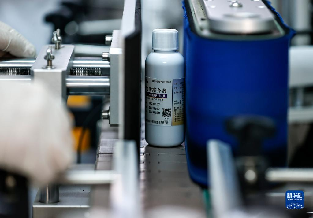 宁夏中医医院暨中医研究院研制的“益气防疫合剂”在包装线上贴标签(11月12日摄)。新华社记者 冯开华 摄
