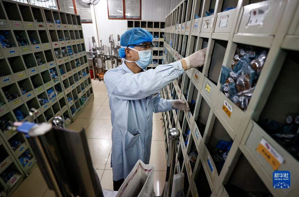 11月12日,宁夏中医医院暨中医研究院中药师取出灭菌后的药剂。新华社记者 冯开华 摄