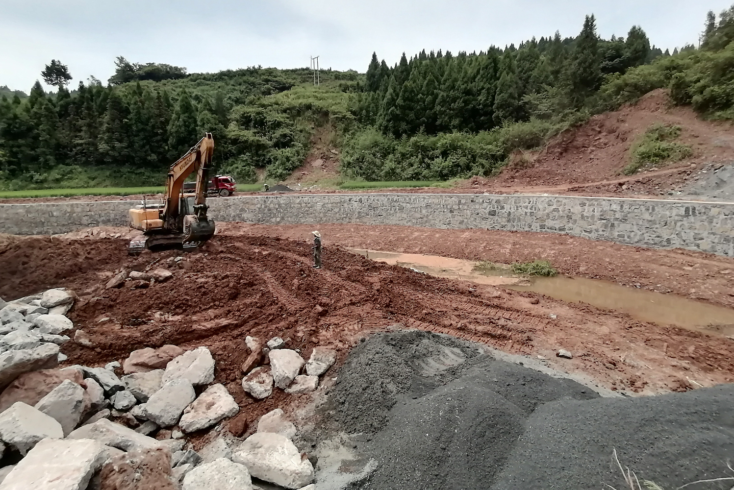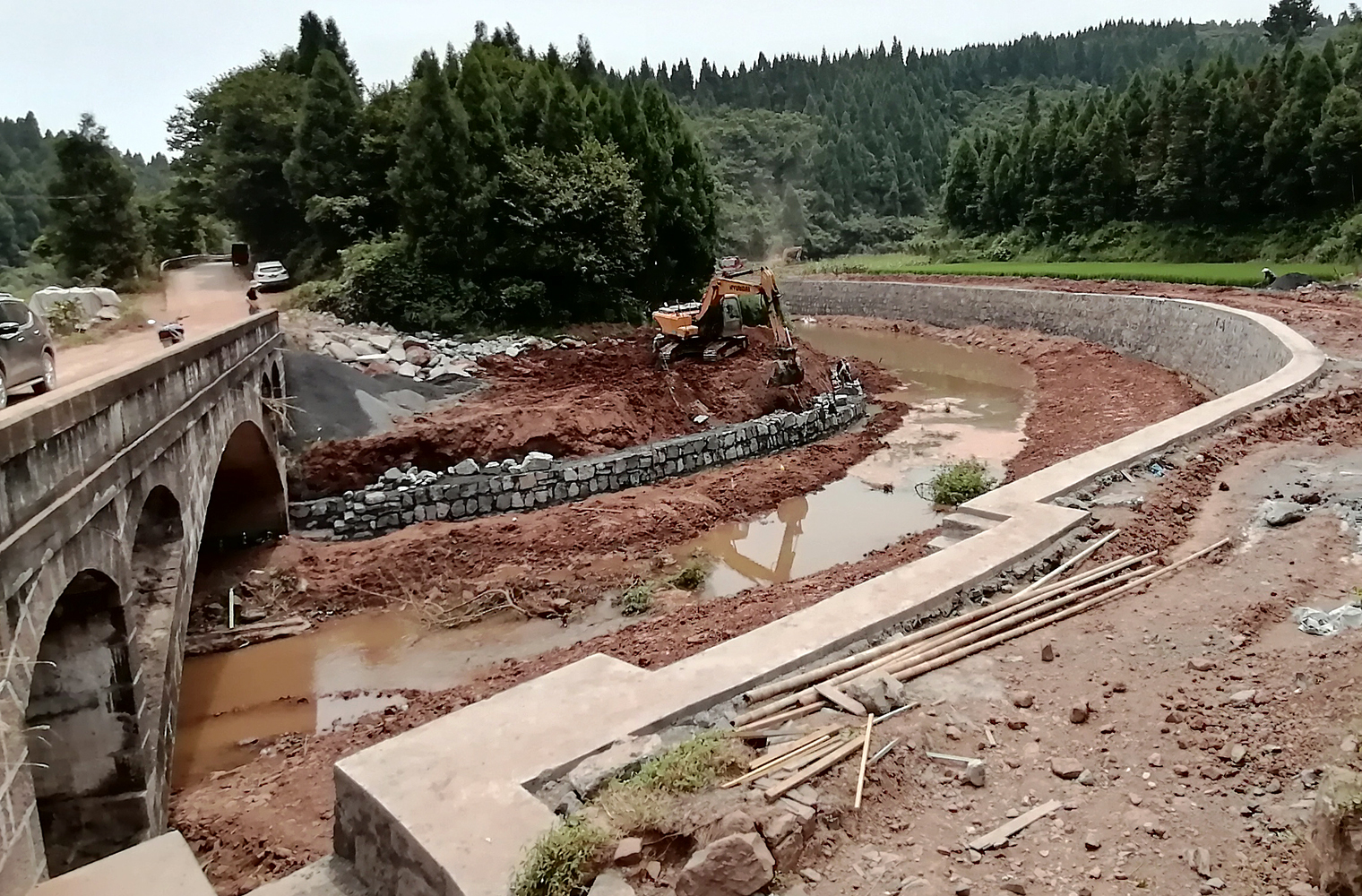 2021年7月18日,施工队正在泸溪县达岚镇龙溪口村5组名叫“企冲大桥”的溪道里采用挖机作业修砌溪堤,以保护溪流两边的稻田。