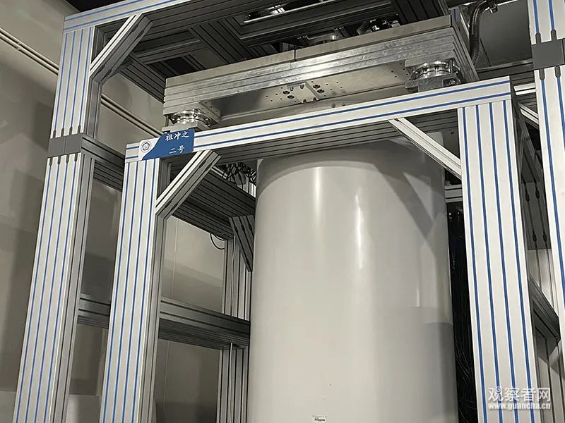 在中国科学技术大学上海研究院的实验室里,观察者网在现场看到了“祖冲之二号”超导量子计算机。在这个依靠巨大的支架“悬”在半空中、外观看起来平平无奇的“桶”里,就有着我国的超导量子计算机“祖冲之二号”。
