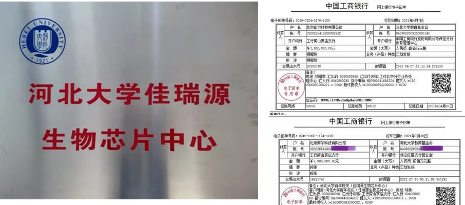 北京库尔科技有限公司对闫教授的研究成果非常的感兴趣,经过多方协商,北京库尔科技有限公司与河北大学成立河北大学佳瑞源生物芯片中心,北京库尔集团捐助生物芯片中心300万人民币,资助中心的建设和支持中心的日常开支。