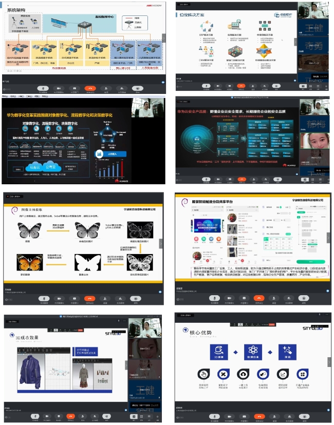 随后,会议进入“数智未来”主题学术报告环节,邀请业界知名企业嘉宾做了技术分享,并进行了全程录像。分别由华为公司的黄富娣经理做《华为云--助力企业数字化转型》报告,海康威视数字技术股份有限公司宁波分公司的朱飞龙经理做《企业复工非接触式防疫管控方案》报告,上海凌笛科技有限公司的邱岩岩经理做《让未来时尚,所见即所得--Style3D 服饰设计》报告,宁波创艺信息科技有限公司的吕高赟总经理做《基于人工智能的服装个性化定制平台》报告,上海伯俊科技的张礼鹏经理做了《伯俊软件技术与产品》报告。近2小时的分享,各位嘉宾结合疫情及行业趋势,从企业实际需求出发,进行了技术、产品和经验的分享,让与会成员近距离聆听了行业前沿资讯。
