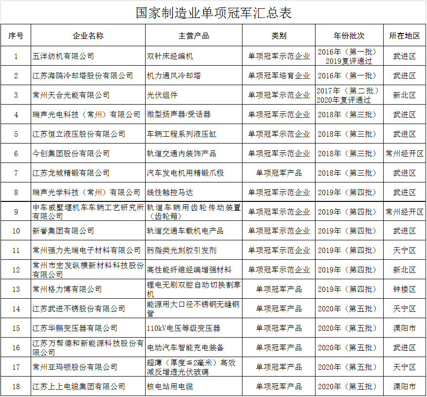 入围数全省第一!常州这些企业和产品获制造业“单项冠军”公示
