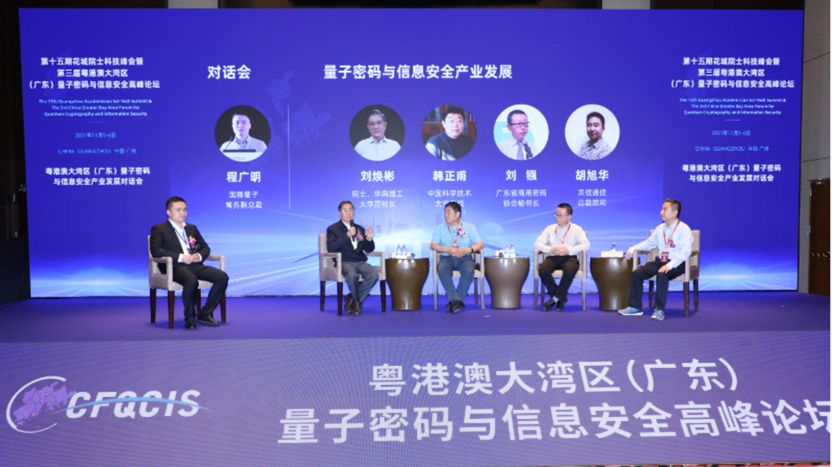 高端对话环节举行粤港澳大湾区(广东)量子密码与信息安全产业发展对话会,刘焕彬院士、中国密码学会量子密码专委会主任韩正甫教授、广东省商用密码协会秘书长刘镪、京信通信总裁顾问胡旭华等嘉宾围绕量子密码与信息安全产业发展开展深入对话,分别就量子密码人才与企业家培养、量子密码技术发展趋势与标准化、加速量子密码产业化进程、产业资本助推量子密码发展等内容展开交流。其中,刘焕彬院士以种树类比创新创业需要的三个环节:要有好的种子(想法)、找到好的土壤(市场)、获取足够的肥料(资金),并表示对国腾量子在量子密码创新发展和产业应用探索之路充满信心。