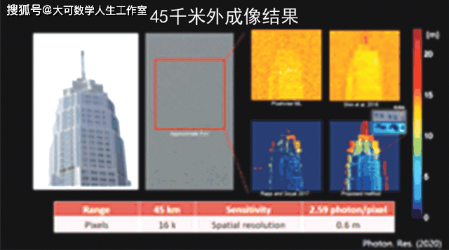 这个10亿倍的进步,使他们能做到很多以前做不到的事。例如,他们在雾霾天,对8.2千米外一个人的模型进行姿态识别,清晰地看到这个模型把手举起来了(图8)。他们在45千米外对浦东民航大厦进行拍摄,也得到了清晰的图像(图9)。因此,他们把这项技术称为“雾里看花”。