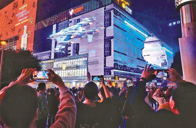江北区观音桥步行街,市民用手机拍摄巨型裸眼3D“太空飞船”,新颖的城市形象展示吸引了不少市民和游客前来打卡。