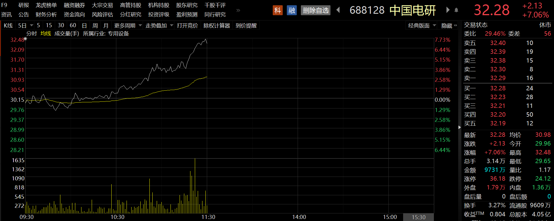 盘面上,锂电设备中,中国电研今早上涨7.06%,报32.28元/股;杭可科技上涨3.66%、星云股份涨1.47%——三者主营业务均为检测设备/后道设备。