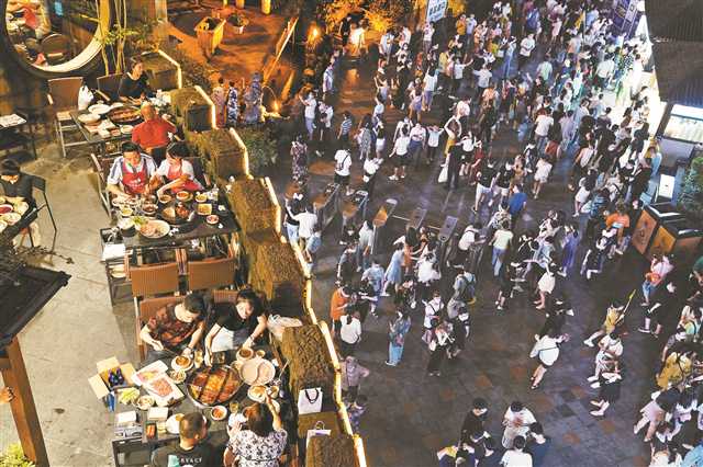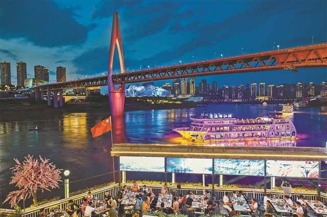 渝中区洪崖洞,“城墙”上吃火锅的人与“城墙”下的游客相映成趣。