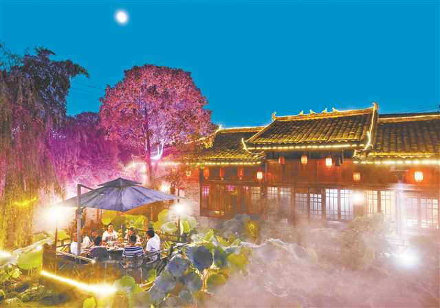 南岸区南山,在荷塘边吃火锅的人们。
