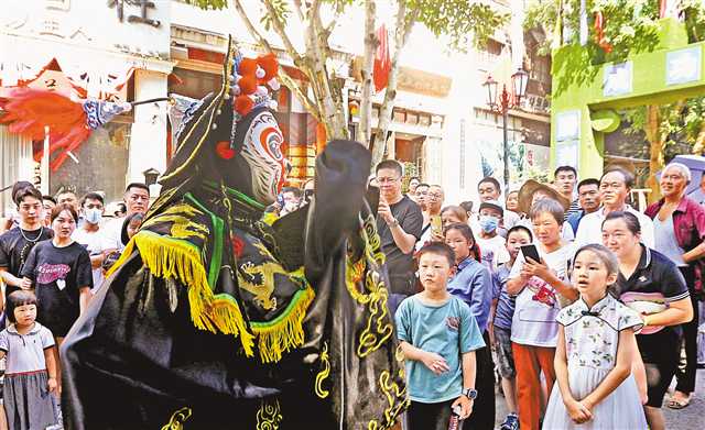 看节目 10月3日,重庆两江影视城举办金秋文化旅游节,吸引众多游客。演员们表演吐火、变脸、转花碟等精彩节目,赢得阵阵掌声。特约摄影 钟志兵/视觉重庆