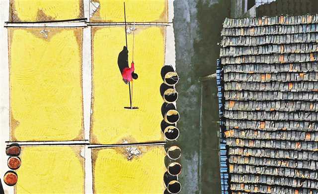 9月22日,酉阳麻旺镇米旺村农家庭院,村民在摊晒稻谷。连日来,当地村民抓住晴好天气抢晒稻谷、玉米、辣椒等,土家山寨和苗寨处处呈现丰收景象。通讯员 邱洪斌 摄/视觉重庆