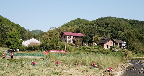 在巡河过程中,志愿者们发现河段两侧杂草丛生,既影响了河道美观,也妨碍了河流泄洪,同时给附近居民生活带来不便。一声令下,志愿者们立即借来柴刀、割草机,集中力量清理杂草,河道又恢复了“一水护田将绿绕,两山排闼送青来”的美景。