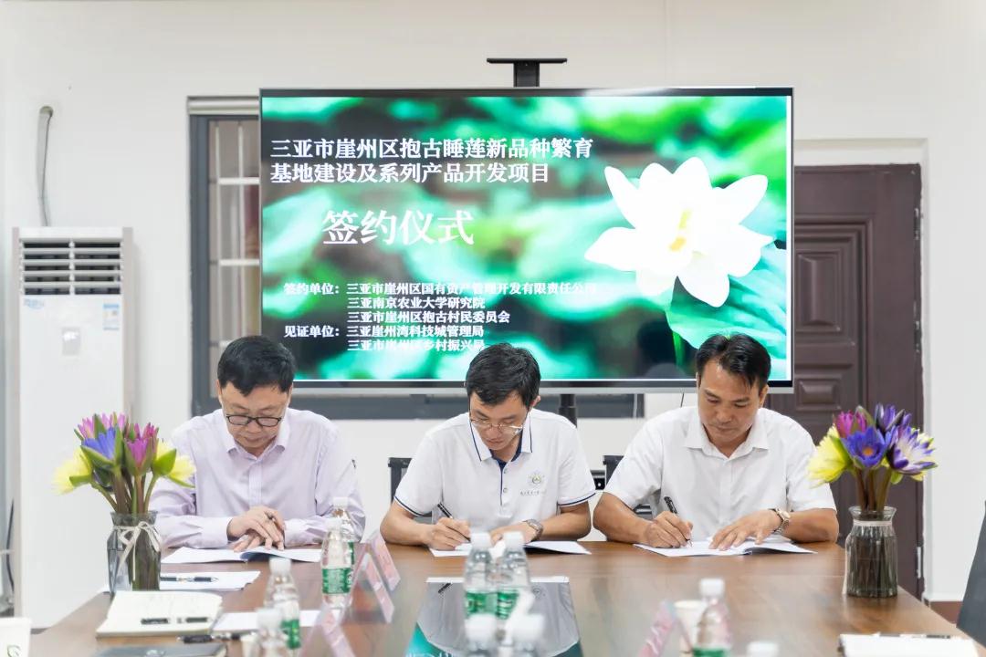 深化产学研合作,共享区域科研成果转化红利,三亚崖州湾科技城涉农高校以科技创新促进地方农业转型升级,助力区域经济发展,11月18日上午,在崖州湾科技城管理局和崖州区乡村振兴局的见证下,三亚市崖州区国有资产管理开发有限责任公司、南京农业大学三亚研究院、三亚市崖州区抱古村民委员会三方就抱古睡莲种质资源圃产业示范基地项目举行签约合作仪式。