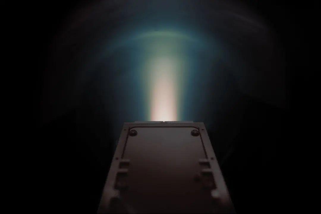 NPT30-I2碘电推进系统的一个飞行模型在真空室内点火。图片来源:TrustMe公司