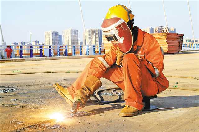 早上8点不到,秋日艳阳已照耀在白居寺长江大桥项目工地上。焊工杨文光顾不上欣赏桥上的美景,就拿起焊枪投入紧张的工作中。只见他身穿长衣长裤,头戴防护罩,麻利地拆除着大桥提梁站支座。豆大的汗水从他脸上滴下,他却丝毫没有放慢工作速度。