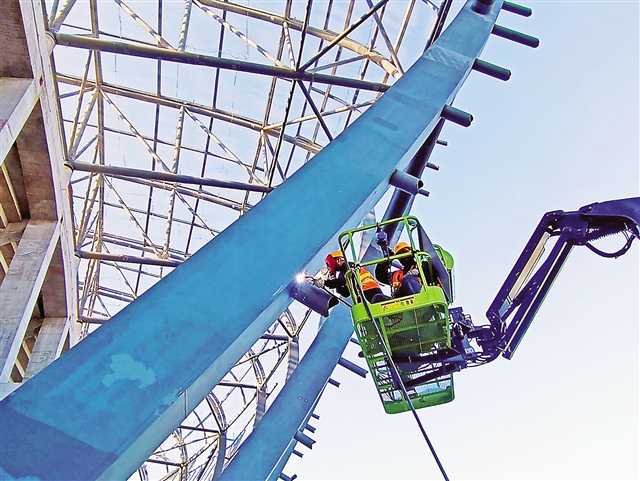 10月1日,重庆龙兴足球场建设工地,工人正进行高空作业。(中建八局供图)