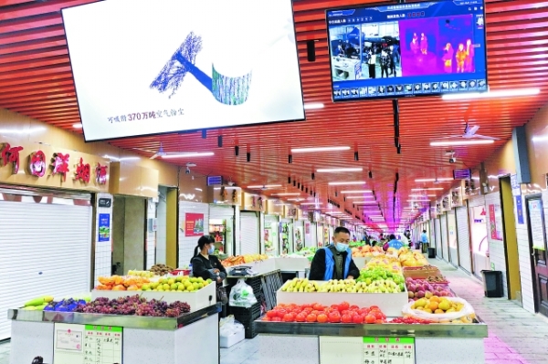 升级改造后,蟠桃宫农贸市场吸引了不少商户进场,丰富了市场业态;摊位按照鲜、活、生、熟、干、湿等进行规范化区域划分,内部环境整洁有序;增设急救箱、公平秤等便民服务设施,配齐食品检测、垃圾分类、公共厕所、通风、消防等设施设备,排水、排污等问题得到有效解决。目前,农贸市场内有120余个摊位,涉及28种业态,能够满足附近一公里以内2万至3万户居民的日常采购需求。
