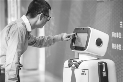 创新创业大赛工作人员在演示参赛项目“笨小宝机器人”服务应用场景 (石美祥摄)