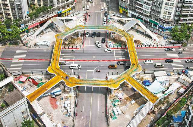 西部(重庆)科学城白市驿镇,一号人行天桥正在施工作业。该镇本月有两座人行天桥完工,解决周边群众出行不便的难题。