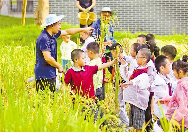 9月2日,两江新区童心青禾小学全校594名小学生上了一堂特殊的劳动课——校园里,师生们共同种植的稻子成熟了,孩子们兴奋地和老师一起下田收稻谷、挞谷子,感受什么叫粒粒皆辛苦。
