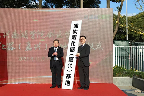 揭牌仪式上,贾文胜、沈旭云、俞亚明分别代表校、企、政三方致辞。盛付祥、沈旭云,贾文胜、俞亚明为嘉兴南湖学院创业学院、浦软孵化器(嘉兴)基地揭牌。
