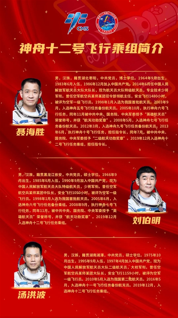 2021年6月17日,我国航天员聂海胜、刘伯明、汤洪波驾乘神舟十二号载人飞船成功进入太空,顺利完成与天和核心舱自主快速交会对接,并开展了一系列创新性、突破性科学试验和空间应用任务,在轨驻留3个月,9月17日顺利返回。