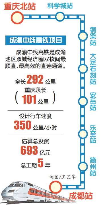 成渝中线高铁是国家“八纵八横”高铁网沪渝蓉沿江高铁大通道的重要组成部分,也是成渝地区双城经济圈双核间最顺直、最高效的直连通道。成渝中线高铁项目全长292公里,重庆段长101公里。全线共设站8座,线路从重庆北站引出,沿线新设科学城站、铜梁站、大足石刻站、安岳站、乐至站、简州站,接入成都站。设计行车速度350公里/小时,估算总投资693亿元,总工期5年。