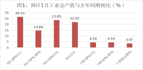 从企业生产情况来看,企业预计1月总产值同比增长、持平、下降分别占65.1%、22.0、12.9%(见图1)。企业2020年利润同比增长、持平、下降分别占59.6%、14.7、25.7%。79.8%的企业反映当前设备生产能力利用率达到70%以上,较上季度提升4.1个百分点。