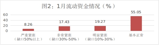 从要素保障情况来看,45.0%的企业反映1月企业流动资金紧张,较上季度下降19.1个百分点(见图2)。企业反映1月用工人数同比增长、持平、下降分别占11.9%、84.4%、3.7%。