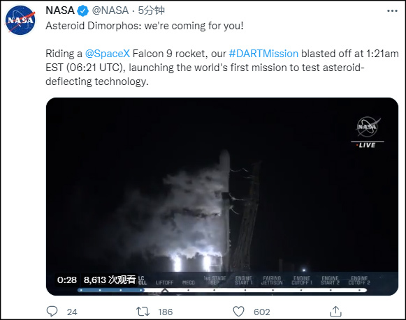 NASA发射首个“行星防御测试器”:明年9月主动撞击小行星