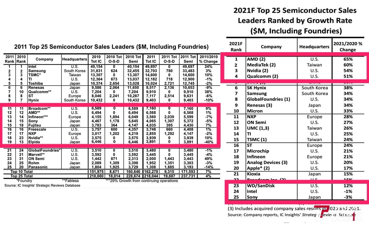 2011年、2021年半导体行业收入增长企业前25位排名(来源:IC Insights)