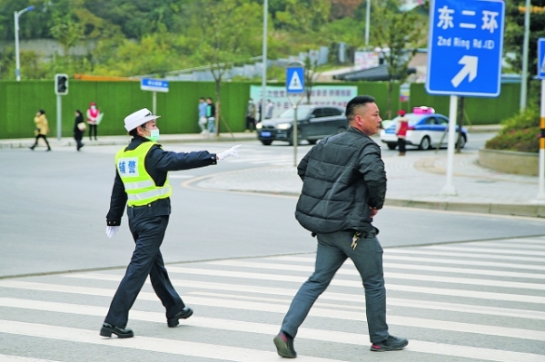 交通辅警在双龙航空港经济区龙水路引导交通。