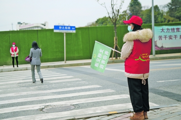 志愿者在双龙航空港经济区一人行横道旁引导行人文明通行。