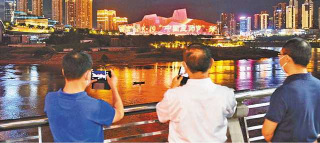 八月十八日,几位医务工作者掏出手机拍下大剧院上演的“中国医师节”灯光秀。记者 崔力 摄\视觉重庆