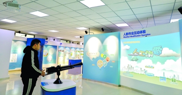近日,清镇市人工影响天气科普馆正式投用。在这个科普馆里,人们不仅可以了解降雨、闪电、冰雹等气象知识,还可以体验不同级别的风力、玩一把增雨防雹小游戏,当一次天气预报主持人。图为群众在体验人工增雨、防雹作业小游戏。