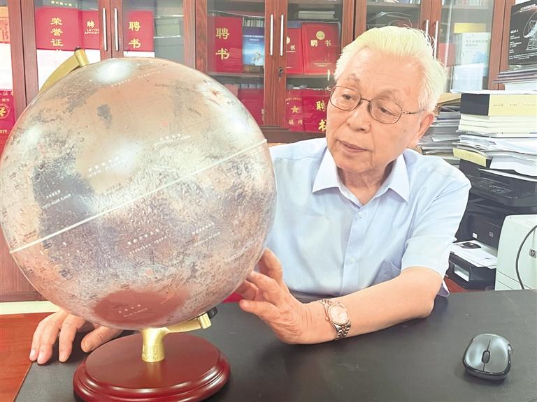 欧阳自远工作之余总喜欢看一看办公桌上的月球仪。