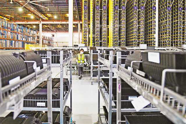 飞力达公司相关负责人介绍,自动化仓库存放货物容量是传统仓库3倍,入库速度是传统仓库3倍,出库速度是传统仓库的2.5倍,收出货准确率达100%。