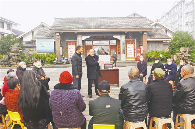11月13日上午,铜梁区南城街道人大干部在黄桷门村给村民宣讲党的十九届六中全会精神。