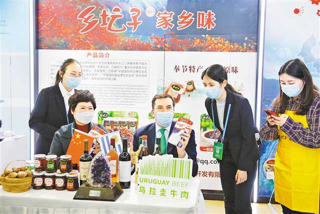 十一月十六日,第十四届中国—拉美企业家高峰会在重庆悦来国际会议中心开幕。图为乌拉圭大使在展厅进行特色产品的直播带货。 记者 罗斌 摄\视觉重庆