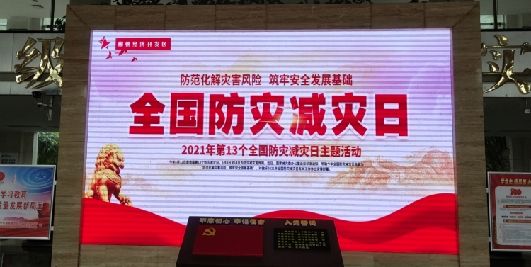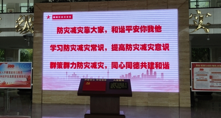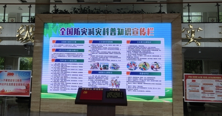 在经开区管委会一楼大厅显示屏上,醒目的宣传海报和宣传标语不间断滚动播放,让管委会各部门干部职工和前来办事的企业员工、群众充分融入到浓厚的防灾减灾知识氛围中。