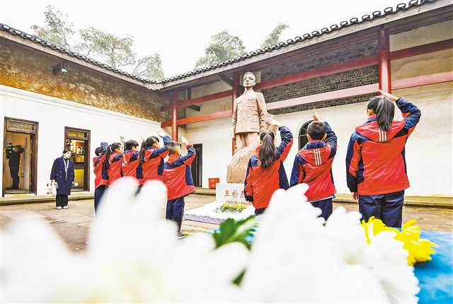 11月24日,南岸区王朴烈士旧居正式开馆,学生代表正在馆内参观并向王朴烈士的塑像敬礼。