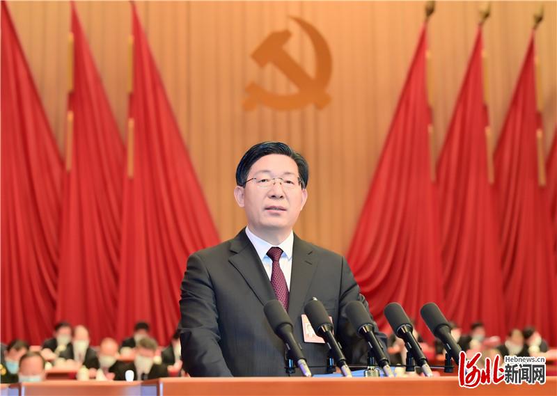 王东峰在热烈的掌声中向大会作报告。报告共分八个部分:一、全面回顾九届省委带领全省人民五年来走过的不平凡历程,河北各项事业发生历史性新变化;二、坚持从党的百年奋斗重大成就和历史经验中汲取强大力量,持续强化党的政治建设和创新理论武装;三、奋发有为走好新的赶考路,加快建设现代化经济强省、美丽河北;四、持续举全省之力办好“三件大事”,打造区域协调发展新的增长极;五、坚定不移完整准确全面贯彻新发展理念,积极构建新发展格局和推动高质量发展;六、大力弘扬塞罕坝精神,全面提升生态环境质量和水平;七、认真践行以人民为中心的发展思想,持续改善人民生活品质和扎实推动共同富裕;八、扎实推动全面从严治党向纵深发展,以自我革命精神推进党的建设新的伟大工程。