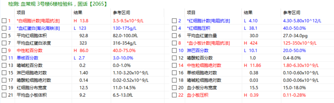 比如下面这份报告单,白细胞明显升高,最后确诊为肺部感染。