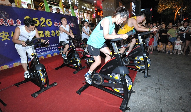 8月1日傍晚,一场别开生面、简单易学的“推动全民健身,助力全面小康”为主题的健身健美表演在安仁县新天地广场举行。群众喜闻乐见的动感单车、健身瑜伽、肌肉健美等文体表演纷纷亮相,让休闲的居民既享受了健身健美的快乐,又学到了相关知识。近来,每逢双休日夜晚,像这样由单位或民间组织的“健身健美地摊”都会出现在安仁的街头广场。(何炳文 何超 摄)