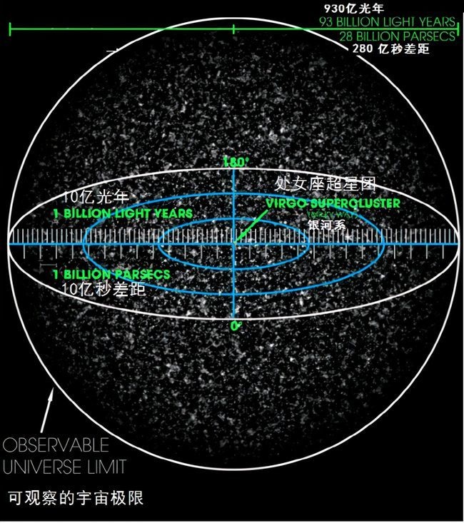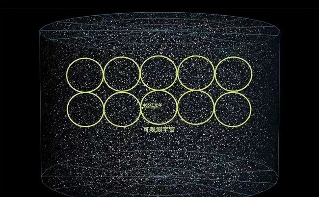 由于相对论中“光速不变原理”的存在,我们能推导出光速是宇宙中物质、信息、信息、能量的最快传播速度。而根据大爆炸理论,宇宙诞生于138亿年前,加上宇宙膨胀的效应,人类理论上可以观测到的范围是直径930亿光年的球状空间,这也被称为:可观测宇宙。