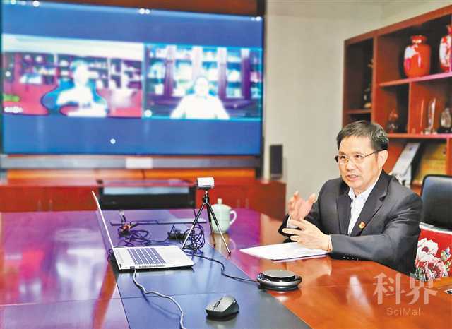 十一月二十三日,重庆智飞生物制品股份有限公司党委书记、董事长蒋仁生,通过视频会议的方式与重庆智睿投资有限公司董事长蒋凌峰远程对话。记者 周奇 摄\视觉重庆