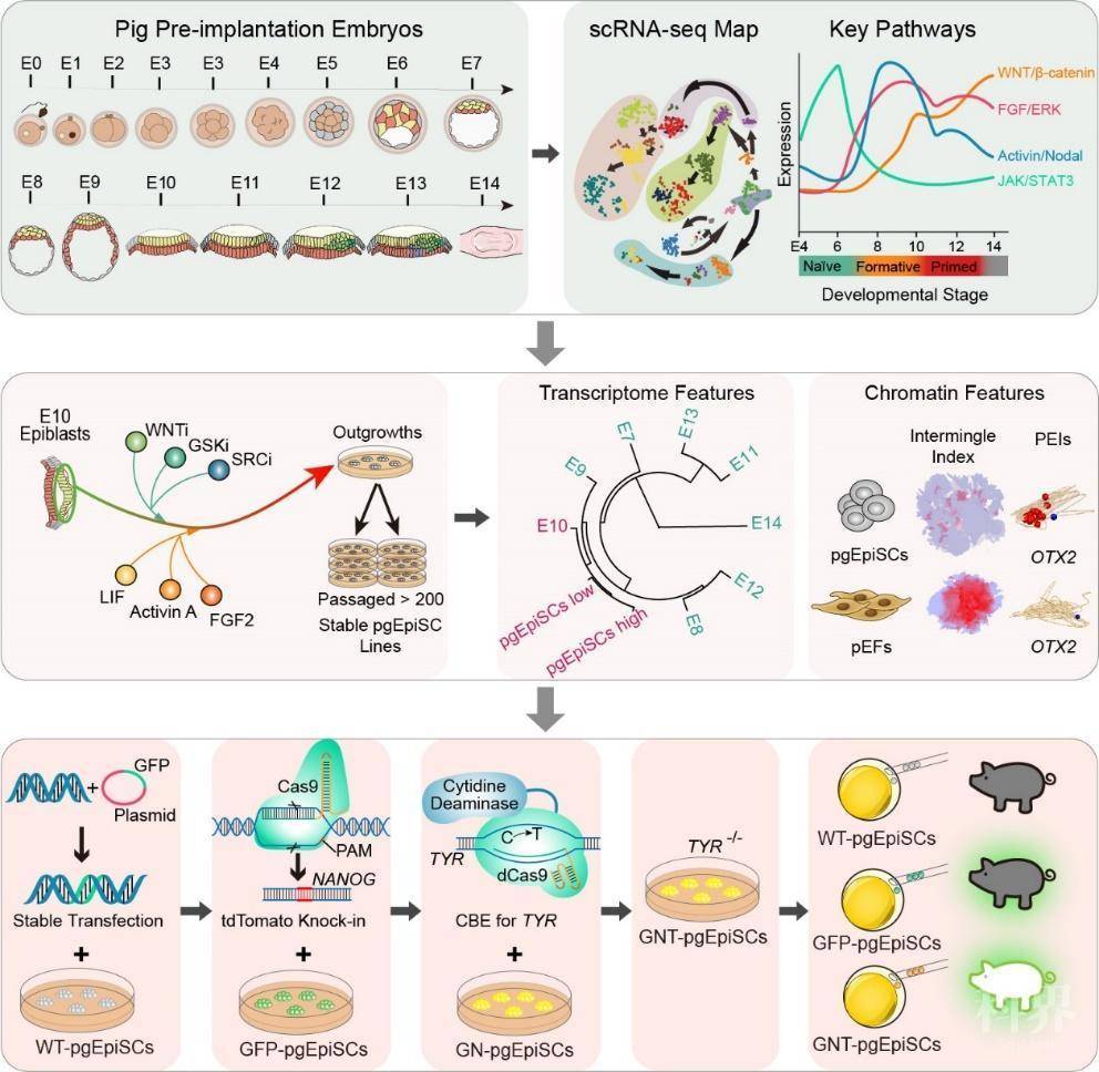 研究人员从早期胚胎多能性发育调控分子机制入手,攻克猪早期胚胎单细胞分离技术, 首次绘制了猪胚胎第0-14天(完整的附植前阶段)高质量单细胞转录组图谱, 解析了猪上胚层多能性状态 (初始态、中间态和激发态) 变化及调控的分子机制;基于单细胞数据, 创制了猪原肠化前上胚层多能干细胞 (pgEpiSCs) 培养体系, 成功建立15株细胞系, 细胞维持上胚层多能性状态, 具有典型干细胞特征,最长传代次数超过260代,是目前世界上已报道传代次数最多的大动物干细胞系。
